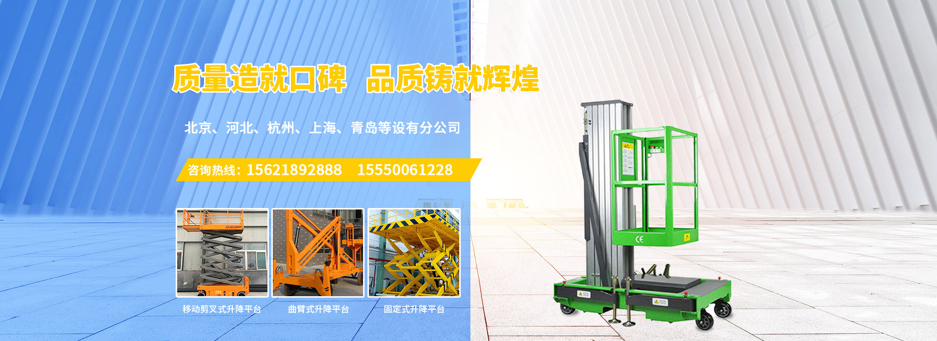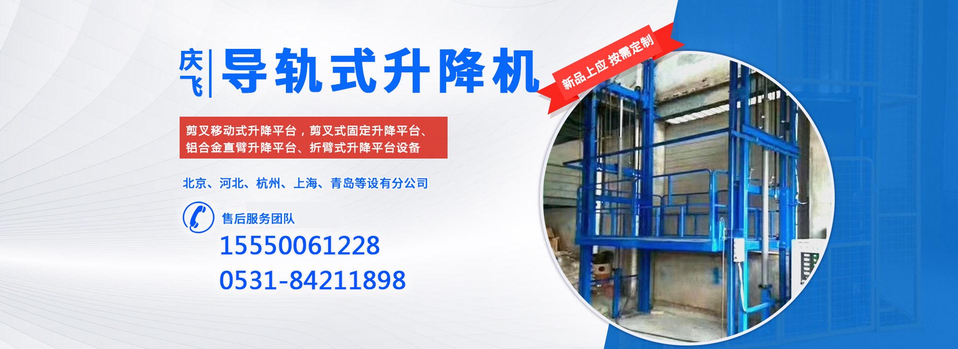 PRODUCT CRNTER濟(jì)南慶飛機(jī)械設(shè)備有限公司目前專(zhuān)心致力于液壓升降平臺(tái)領(lǐng)域。公司主要產(chǎn)品有:剪叉移動(dòng)式升降平臺(tái),剪叉式固定升降平臺(tái)、鋁合金直臂升降平臺(tái)、折臂式升降平臺(tái)、曲臂式升降平臺(tái)、車(chē)載式升降平臺(tái)、牽引式升降平臺(tái)、自動(dòng)行走式升降平臺(tái)、移動(dòng)式固定式登車(chē)橋、桅柱式鋁合金升降平臺(tái)、鋁合金升降舞臺(tái)、固定軌道臺(tái)面旋轉(zhuǎn)式升降平臺(tái)等,產(chǎn)品廣泛適用于電力、通訊、路燈、交通、交警、建筑裝簧、園林、廣告、高速公路、大型廠(chǎng)礦企業(yè)等領(lǐng)域,還可根據(jù)用戶(hù)的需求設(shè)計(jì)制造包括特殊尺寸、承載能力、防爆電器的液壓升降臺(tái)。